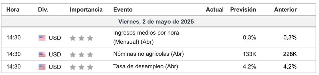 Segundo, Nóminas no agrícolas (Abr): Una fuerte caída en la creación de empleo muestra una desaceleración del mercado laboral. Esto suele considerarse negativo para el dólar y positivo para Bitcoin, ya que una economía más débil reduce la probabilidad de subas de tasas de interés.