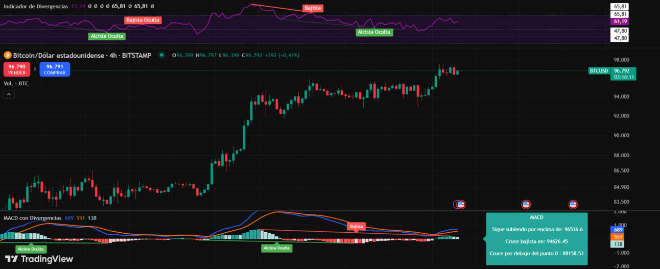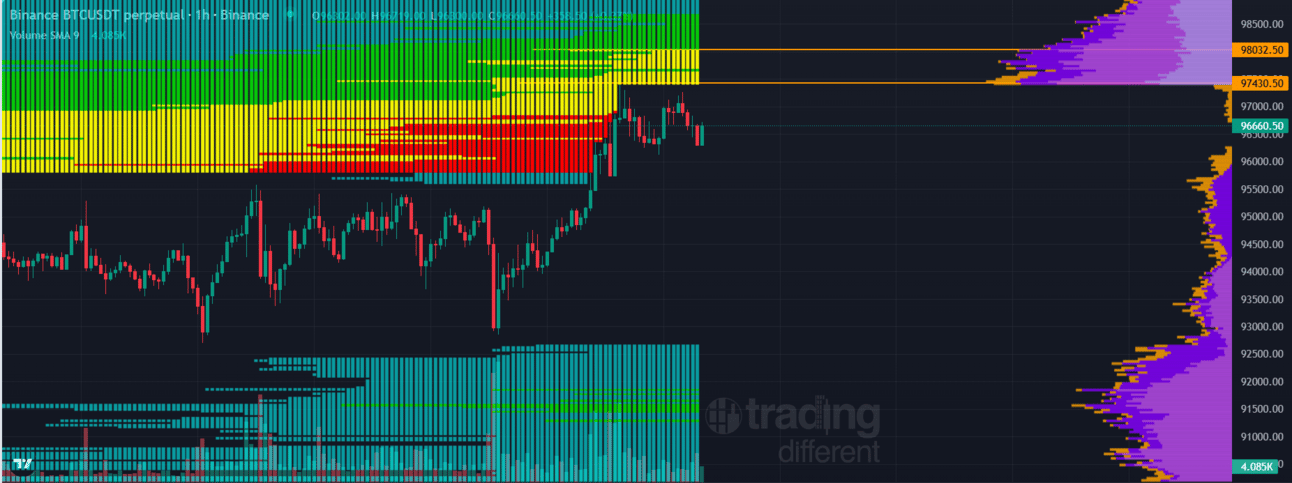 🗣️Resumen de lo esperado hoy: Ayer bitcoin tuvo una subida hasta los 97.000 $, llevandose asi las liquidaciones que teniamos en el camino, el precio sigue estando dentro del canal alcista y estamos bajando lento nuevamente, faltara poco para ver por fin la ruptura del canal o veremos otro rebote al tocar ell suelo?, al ser un canal el momento de su ruptura suele ser mas impredecible, por lo que hay que estar atentos a cualquier cambio significativo.