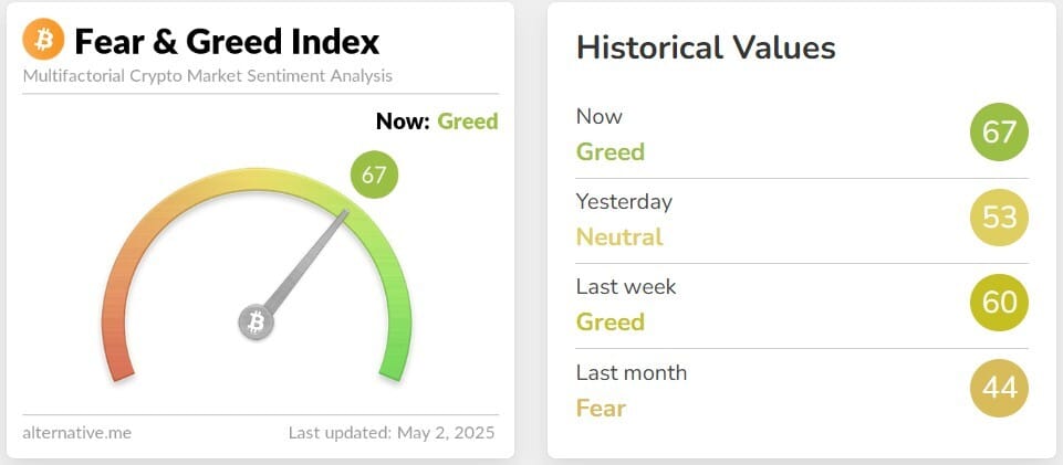 💜Miedo y codicia del mercado: 67 puntos (Neutral)